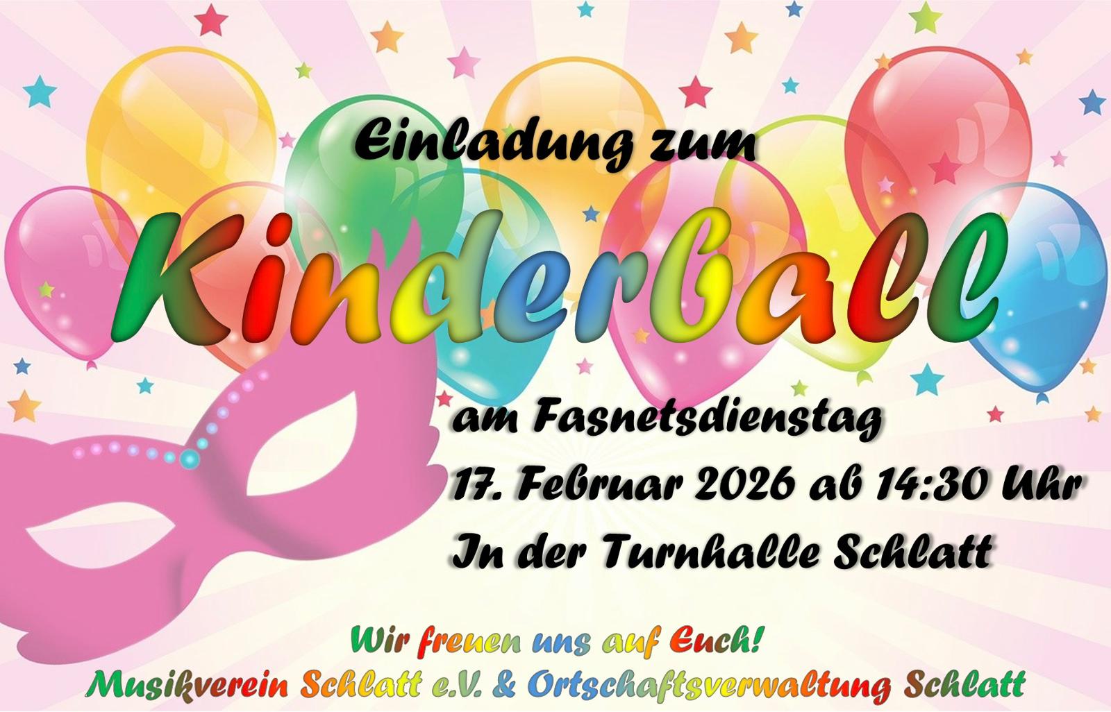 Die Ortschaftsverwaltung und der Musikverein Schlatt veranstalten am Dienstag den 17.02.2025 ab 14.30 Uhr den traditionellen Kinderball in der Turnhalle in Schlatt.