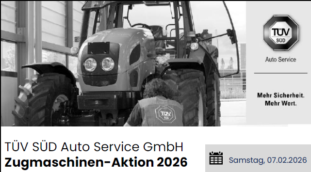 Der TÜV SÜD kommt am Samstag, 7. Februar 2026 von 11:45 bis 12:30 Uhr nach Schlatt, um die Hauptuntersuchung gemäß §29 StVZO von land- und forstwirtschaftlichen Fahrzeugen sowie deren Anhängern durchzuführen. Bitte beachten: die Hauptuntersuchung findet auf dem Ast, beim Feuerwehrhaus statt!